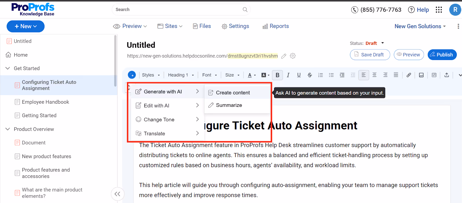 - AI Writer & Content Automation – Quickly generate and enhance help articles using built-in prompts and smart suggestions, saving time for support teams.