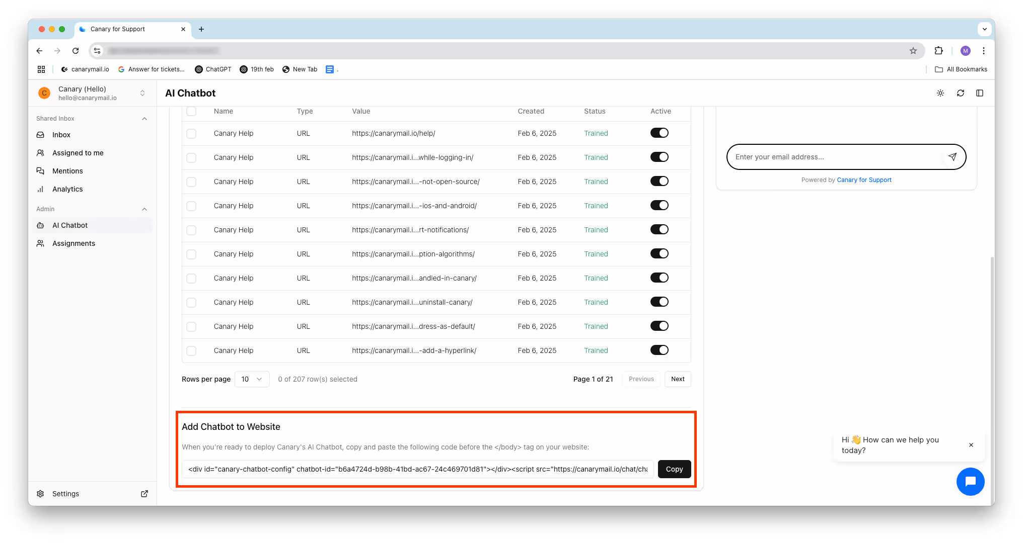 Shared Inbox by Canary’s AI Chatbot makes it easy for users to get instant support on your website. Follow these simple steps to train and embed the chatbot on your site.